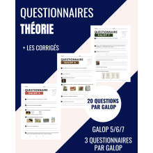 Enseignants d’équitation & Centres équestres : facilitez la préparation des Galops 5, 6 et 7! Vous préparez vos cavaliers aux examens fédéraux? Gagnez du temps et proposez des questionnaires complets de théorie des Galops 5 / 6 / 7 conformes au programme de la Fédération Française d'Équitation. 🔎 Au programme : ✅ Questions variées ✅ Thèmes clés : hippologie, soins, alimentation, biomécanique, réglementation, ✅ Supports prêts à imprimer ✅ Idéal pour évaluations ou pour révisions 🎯 Pour qui ? ✔ Enseignants d’équitation ✔ Centres équestres & écuries de propriétaires Imprimez à volonté les questionnaires de théorie et leur corrigé. Qu'y-a-t-il dans ce contenu? - 3 questionnaires par galop, Galop 5/6/7 soit 9 questionnaires - 20 questions par galop - Chaque questionnaire a son corrigé